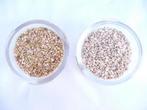 TAILLE 2/5 mm image de gauche : couleur du galet de marbre résiné - image de droite : couleur du galet de marbre sec avant mélange avec la résine.