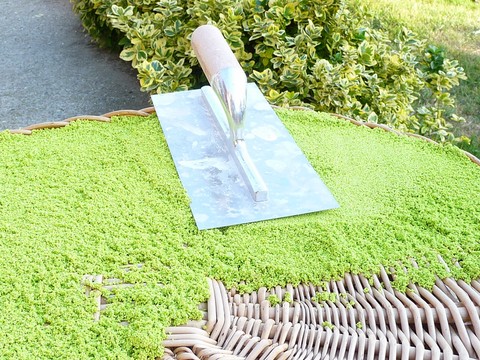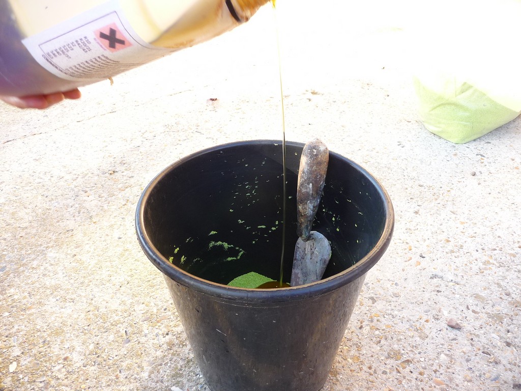 Mélanger la résine avec les sables dans un récipiant et melanger jusqu'a l'obtention d'une pâte homogène, étaler, tasser et lisser.